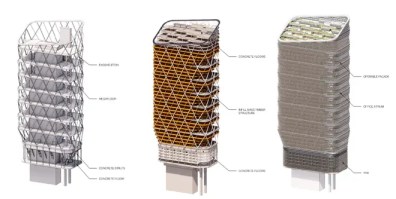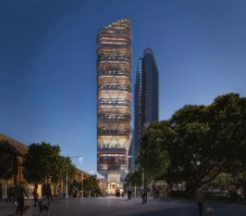 AE Interests: 590-foot-tall, 1.2-million-sf commercial tower composed of six interconnected timber “habitats” supported by steel megafloors and an external exoskeleton. Features a carbon-sequestering hybrid mass-timber structure, natural ventilation, and energy-efficient façade design operating on 100% renewables. Includes a 137-room hostel, retail and civic spaces integrated with a preserved historic train shed, and office space for over 5,000 technology workers.