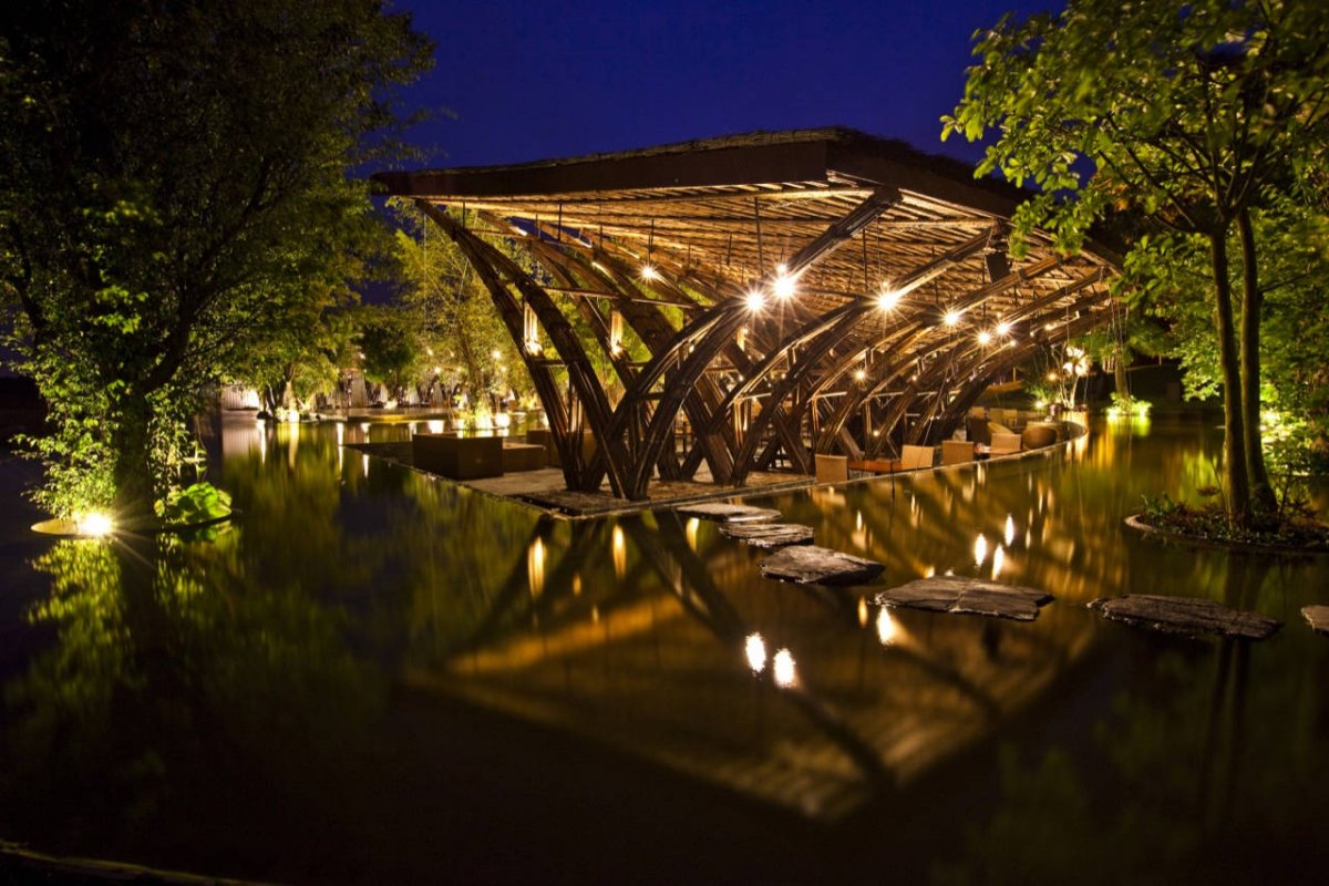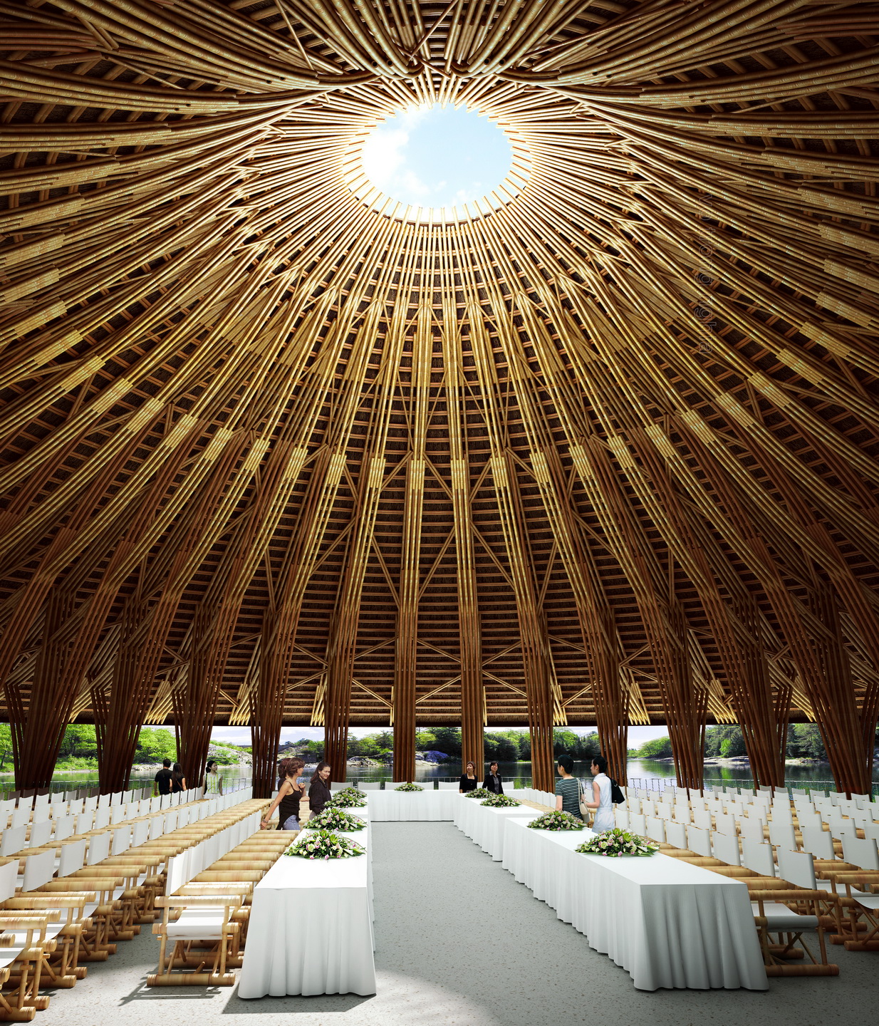 AE interests: Two restaurants and a circular events center; Largest bamboo dome ever created, 30 meter diameter [a]; entire structure is made of pure bamboo as if in the midst of a bamboo forest [b]
