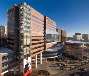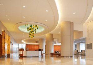 AE Interests: A two-story circular sky bridge connects the Pavilion for Women with the West Tower and Clinical Care Center. The building consists of multiple curves, no ninety degree angles, to enhance the views of and from the building.