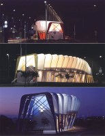 AE Interests: Three identical amenities buildings distinguished by color. Translucent fabric canopies, ribbed tension structure