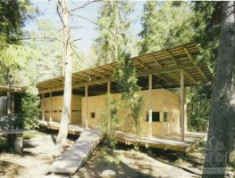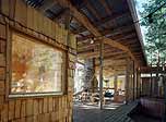AE Interests: Unique razor-blade roof, sustainable design – naturally ventilated and naturally lit, made of recycled and recyclable materials, including the forest of recycled electric poles surrounding the pavilion.