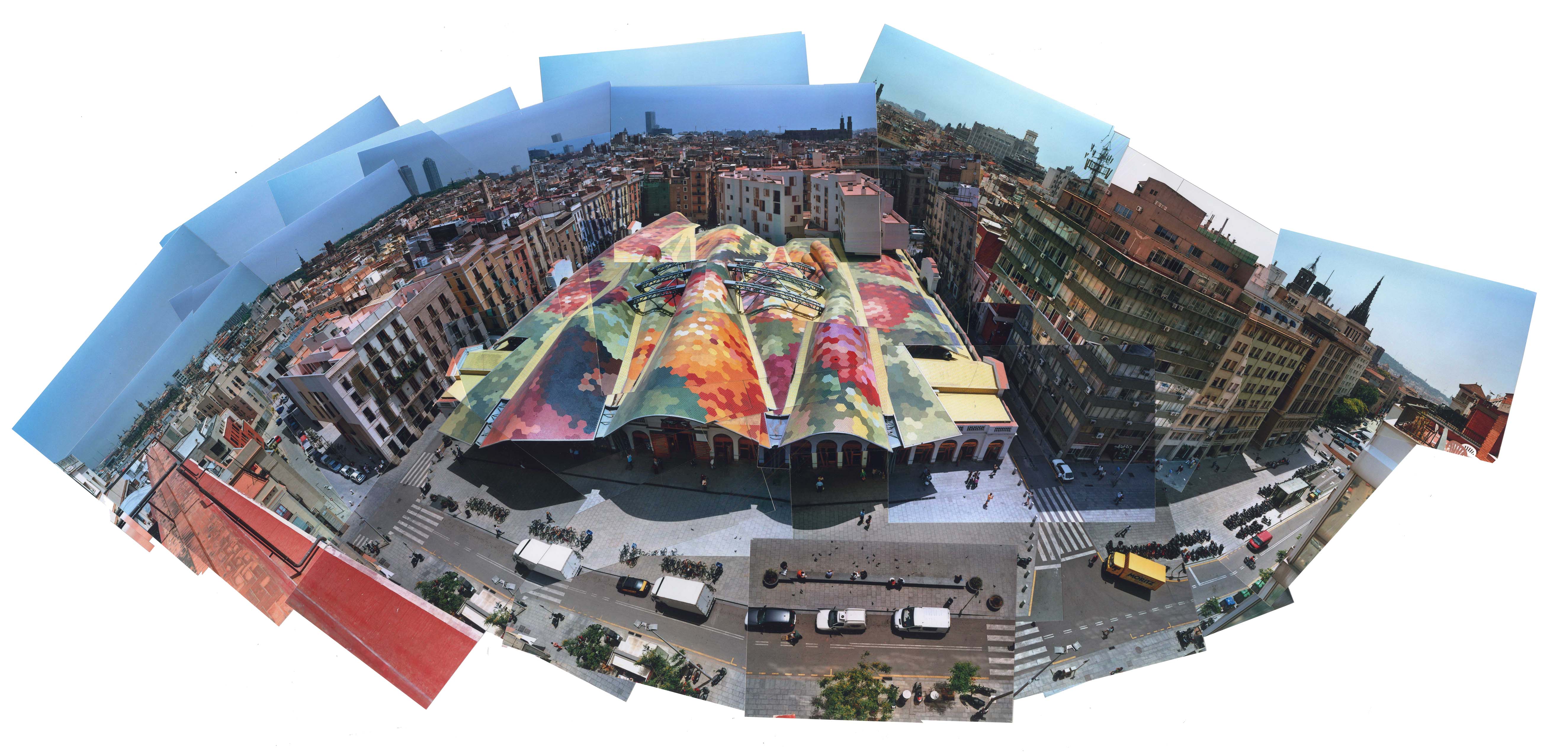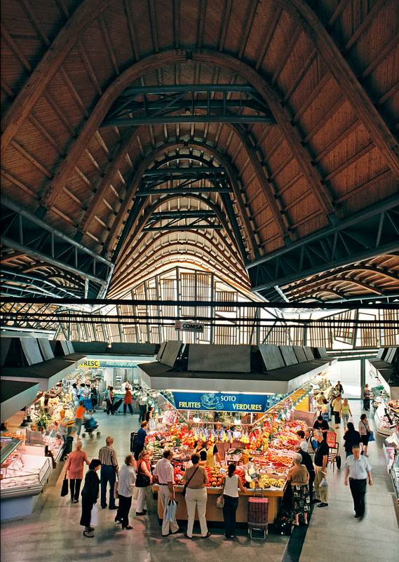 AE Interests: Eccentric new roof flying over the walls of a neoclassical market, irregular arches with interior wood cladding and center bracing. It was an attempt by the city authorities to control complexity in the area’s development. The architects consolidated what had been the broken, irregular path of the unrealized avenue, in contrast to the urban-scale order that would have been imposed over the winding maze of medieval streets.