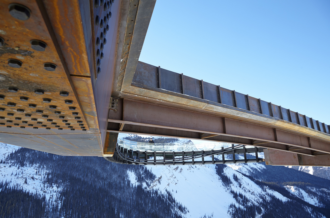 AE Interests: Cantilevered corten steel and glass structure, parabola shaped, trapezoidal box girders supported at the cliff, then extended curved end is cable supported