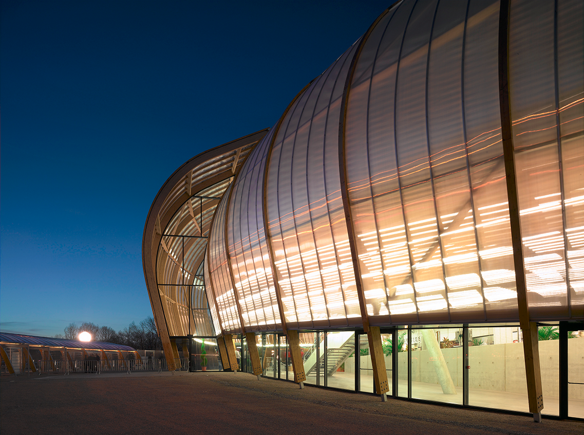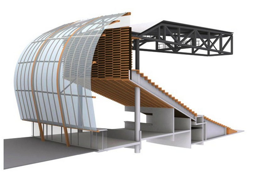 AE Interests: Double envelope: an outer skin made of wood arcs and translucent rigid poly-carbonate sheets and an inner acoustical envelope of locally grown Douglas fir, meant to filter light, heat and acoustics. A good example of energy conservation and use of renewable materials.