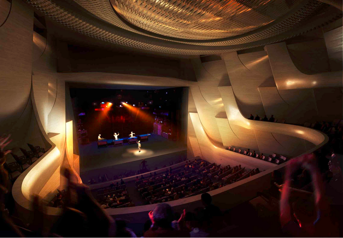 AE Interests: Performing Arts Center, complex interior theater, intricate pattern of louvers, curved roofs.