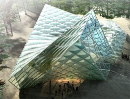 AEInterest: spiritual center and multifunctional assembly hall, “scene-o-graphic background,” diamond-shaped crystal envelope from 3 different geometric prefigures; previously closed land in which nature has flourished.