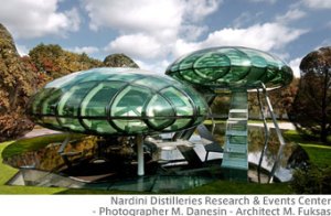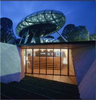 AEInterests: underground auditorium, one bubble contains testing lab, other multifunctional hall, made of laminated glass curved in 2 directions. did not require to cut any trees, climate control system, low energy consumption.