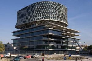 AE Interest: Amorphous roof landscape, fully glazed main facade with an inward trumpet-formed deformation. Glass-and-steel translucent skin envelops and deforms the entire building.