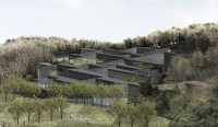 AE Interests: cross-sections that blend in with the mountain slope, facade incorporates recycled clay tiles and stones from old houses in the area