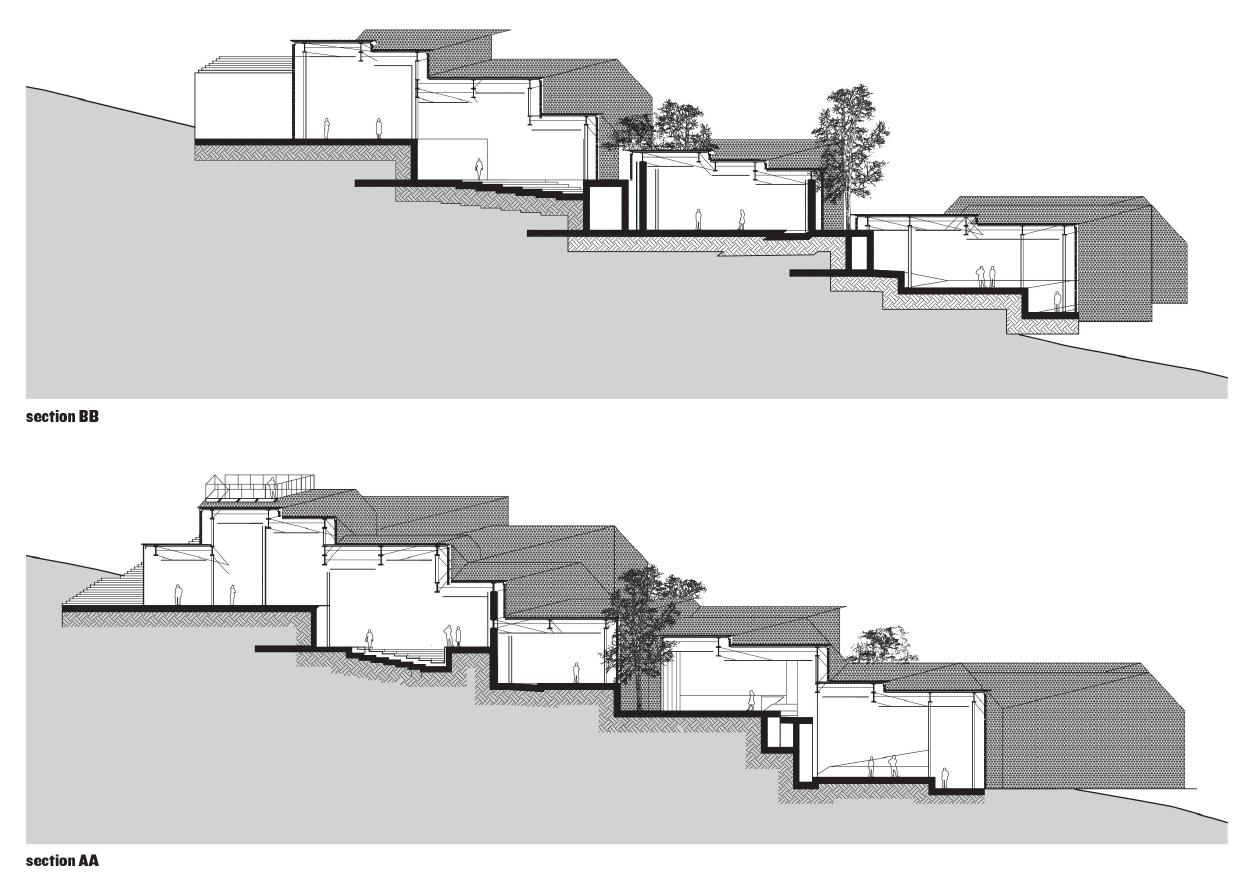 AE Interests: cross-sections that blend in with the mountain slope, facade incorporates recycled clay tiles and stones from old houses in the area