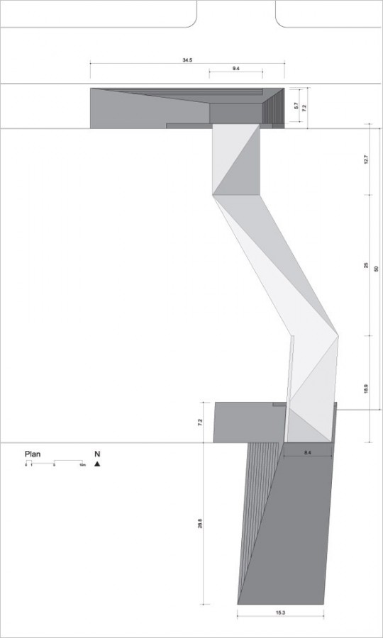 AE Interests: angular form, asymmetrical structural supports, sloped ceiling designed to capture and reflect artificial and natural light.