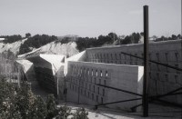 AE Interests: Built in an industrial area where most of the land had been dug out for quarries, Miralles tucked the tiered layout into the stone hills. The cemetery was built of reinforced concrete to reflect the industrial surroundings. There are many examples where the reinforcements are exposed, creating bold, rusting lines repeating throughout the form. The cemetery also houses a chapel and monastery that have yet to be completed.