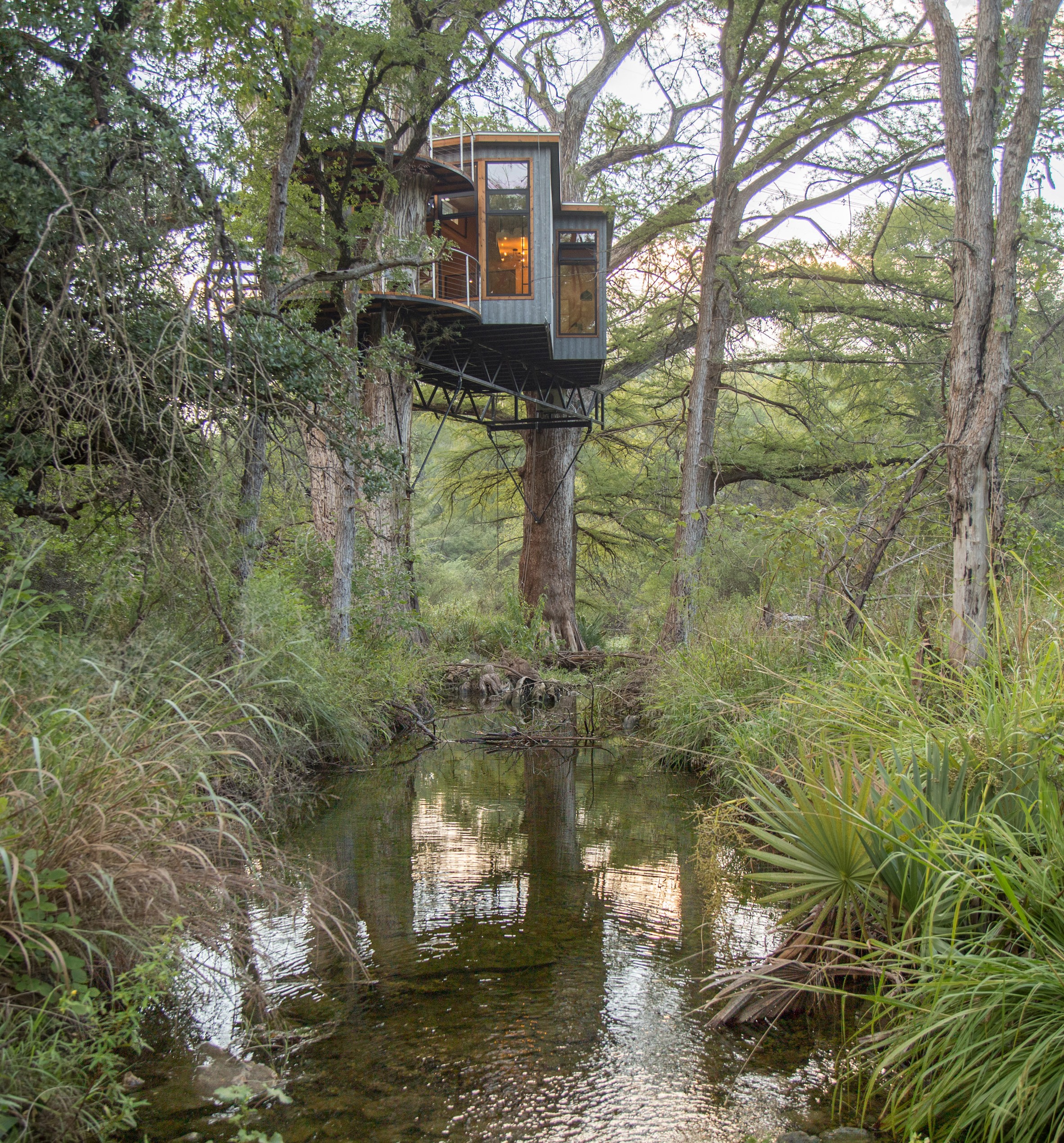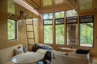 AE Interests: Perched 25 feet above ground, the Yoki Treehouse is the first luxury treehouse resort that has come to Austin, Texas. Steel open webbed joists balance the structure between two massive trees. The treehouse itself is constructed of sustainable woods such as elm and cypress wood and wrapped in metal siding to call upon the traditional rustic Texan style. The interior, however, is designed in a clean, modern way. The property is split up into two constructions, the living areas in the trees and the bathhouse that sits on solid ground, connected by a 60 foot suspension bridge.
