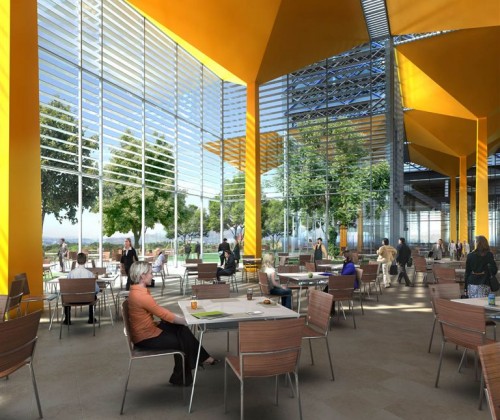 AE Interest: crystal cones designed with photovoltaics, natural light, tempered glass, 35 meters deep, 8000 m2 garden, 1600 parking spots, concrete structure, won “Project of the Year 2014” Award