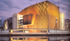 AE Interests: Form follows function, largest stage in Europe, designed to compliment Frank Gehry´s Guggenheim Museum, cor-ten steel casting, patterned glazing on the waterfront