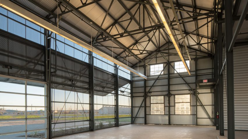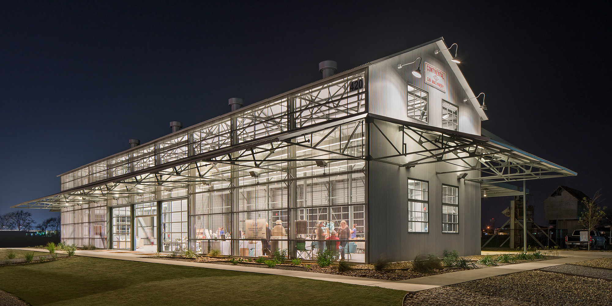 Reuse of 2 existing 1938 cotton gin structures, public event space, exposed steel structure, perforated stainless steel over glass [c]