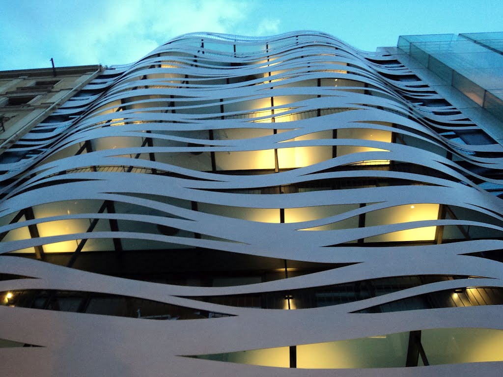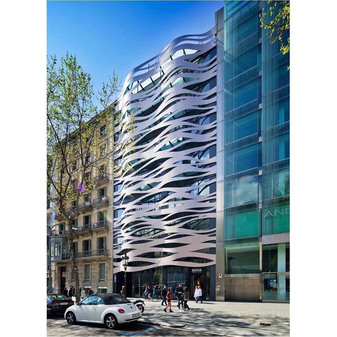 AE Interests: previously an office building, remodeled into a hotel, 8 mm aluminum facade inspired by Gaudi’s organic shapes, facade added for privacy and masking of the black elevation behind it