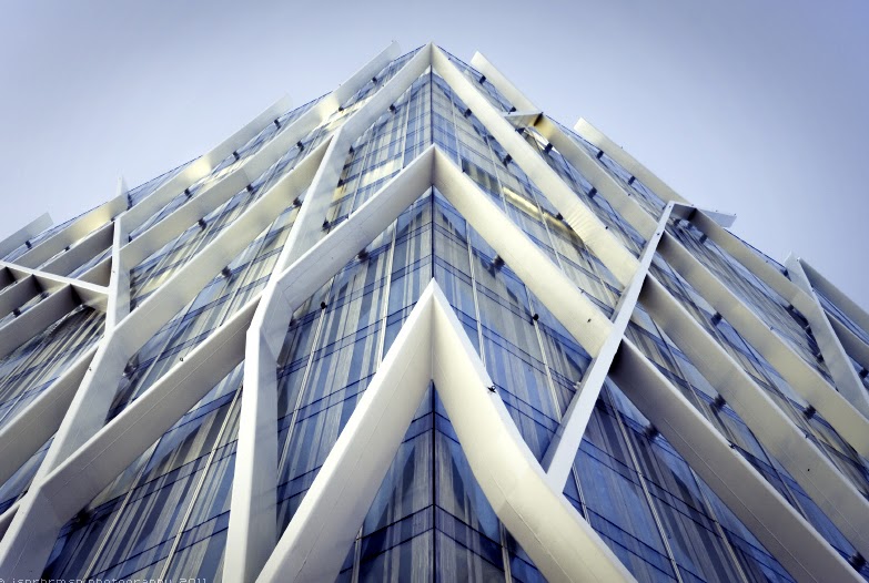 AE interests: trapezoidal prism, tube-in-tube structural scheme, interior structure composed of small vertical columns, exterior diagonal grid for gravity and lateral loads, erected in 8 months, open-plan working floors