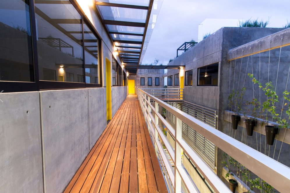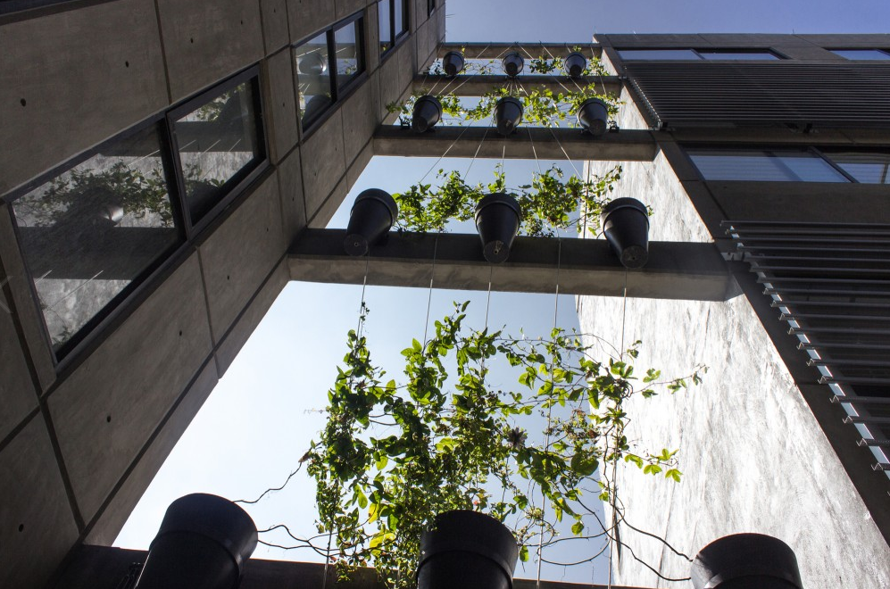 AE Interest: Exceptional environmental performance. Terraced urban gardens where food and ornamental plants are produced. Program for waste management and recycling. Rainwater is collected by a cascade type system, treated in a treatment plant and reused in toilets and terraces. Interior walls of straw and frame of bamboo.