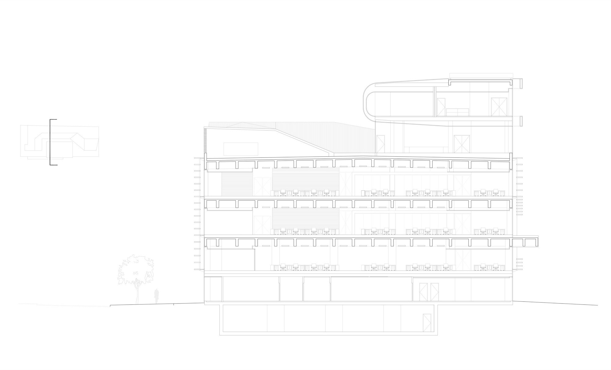 “green carpet” roofs hide mechanical systems and rainwater storage tanks, reduce noise pollution, and absorb CO2 emissions, sun protection slats and photovoltaic panels manage solar impacts, cold beams integrate lighting and HVAC, estimated 60% energy savings [a]