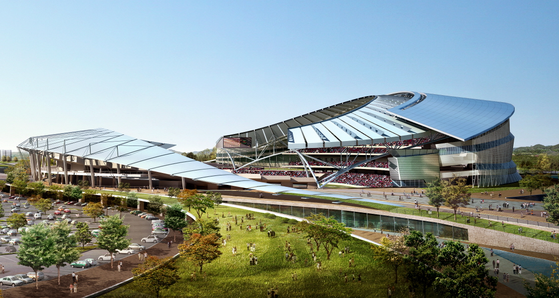 AE Interest: Stadium reduces down to 30,000 seats from 70,000 seats after the 17th Asian Games as a People’s Park, Dynamic form symbolizes the traditional Buddhist ritual Seung Moo dances