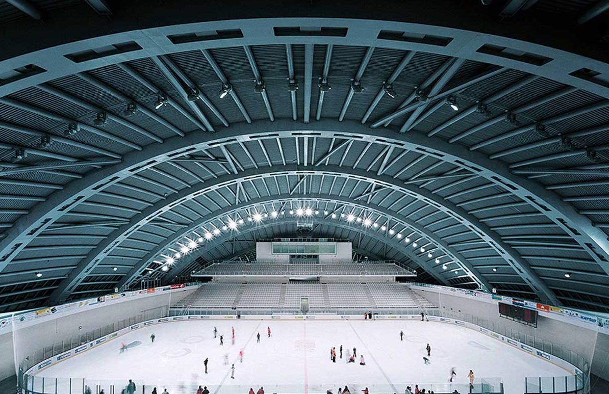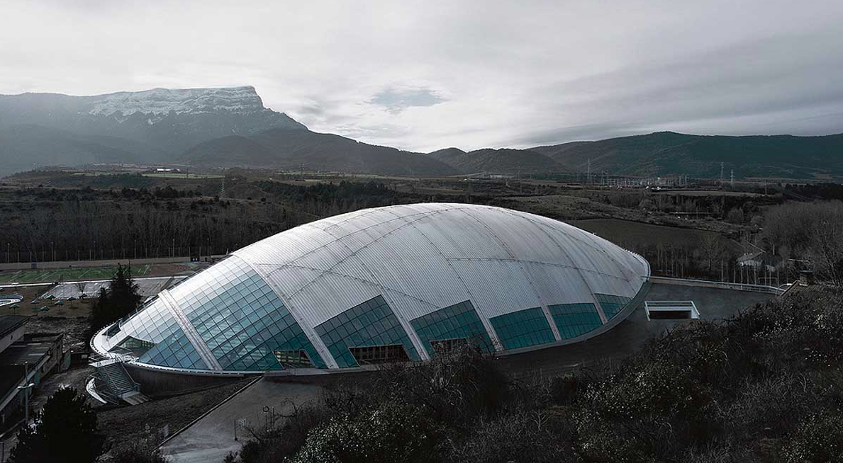 AE Interest: Representative of the European Youth Olympic Festival of Jaca 2007; Dome shape takes strength of nearby mountains with no visible facade; Membrane perceived to be soft crystal ice; Only concrete, brick, and ice under “delicate” shell
