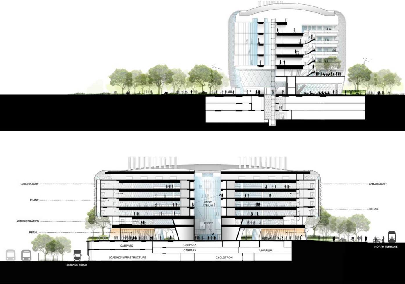 AE Interest: Visual connection between floors via large spiral staircase | Adaptable transparent triangulated dia-grid facade | Parklands extend below lifted structure | LEED Gold