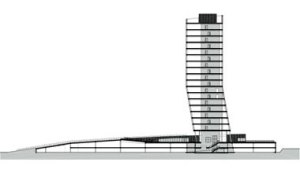 AE Interests: Aluminum and glass façade with pixelated pattern, lower 8 floors of 17 are tilted 10 degrees, bent structural form made possible with hybrid construction of concrete and steel.