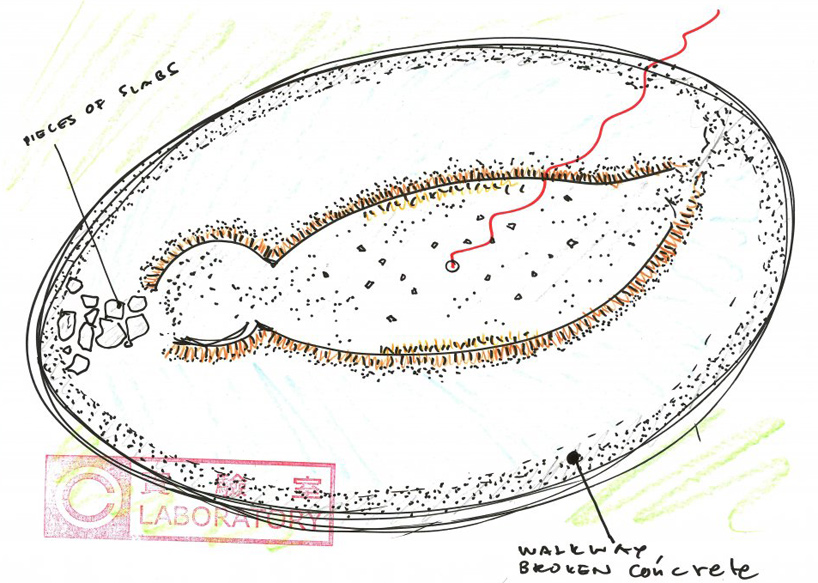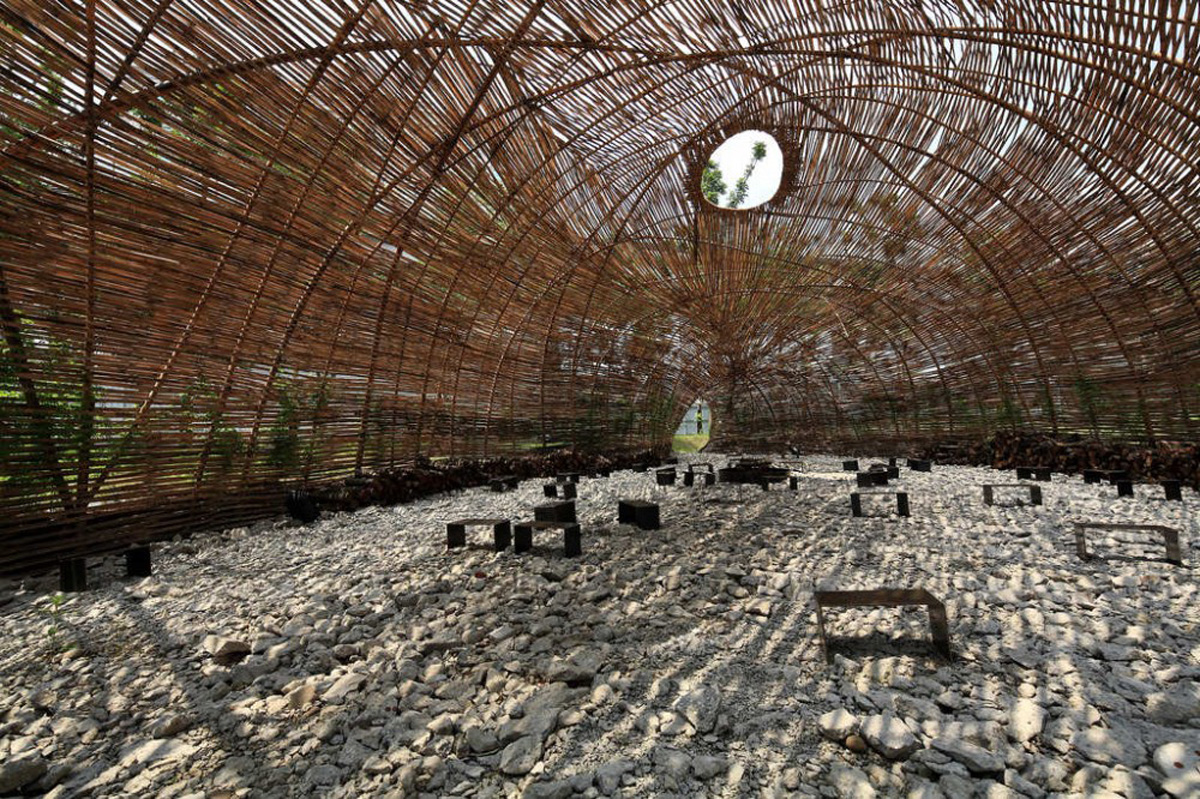 AE Interests: cocoon-like structure, crisscrossed woven bamboo strips that allows for small holes to filter in light, surrounded by broken rocks and concrete that turn into a pathway to the entrance all within a small grass space, central fireplace underneath an aperture in the roof, the structure is meant to be an organic void in a highly urban area, small benches throughout the structure, other materials used are broken glass steel, earth