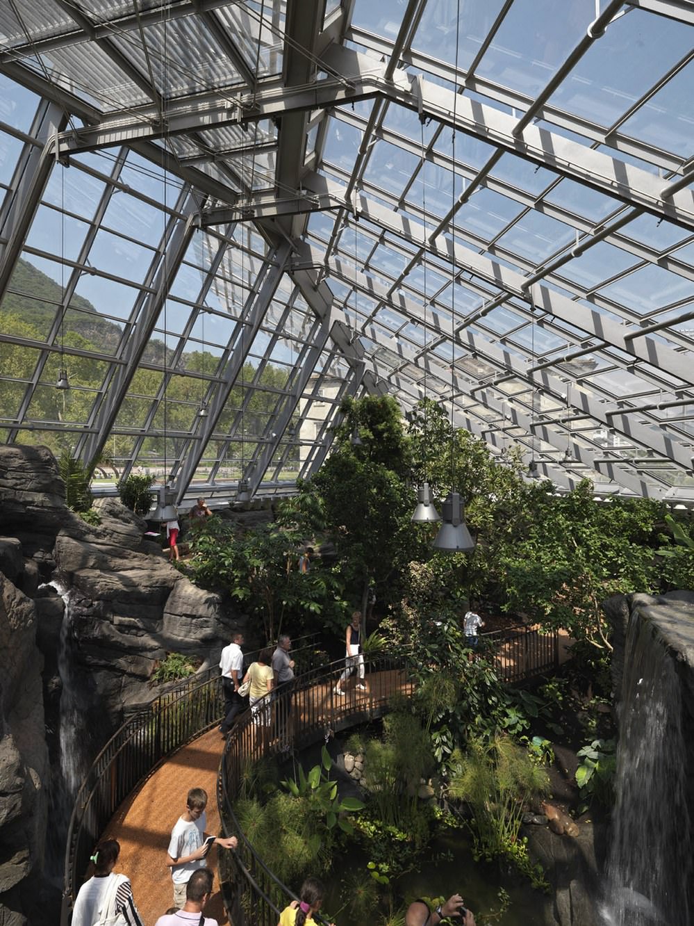 AE Interests: curved glass facades, enclosed urban space covered with transparent Ethylene Tetrafluoroethylene (ETFE) film, climate walls, geothermal heat pump system connected to an underground river, photovoltaic panels laminated into the south façade.