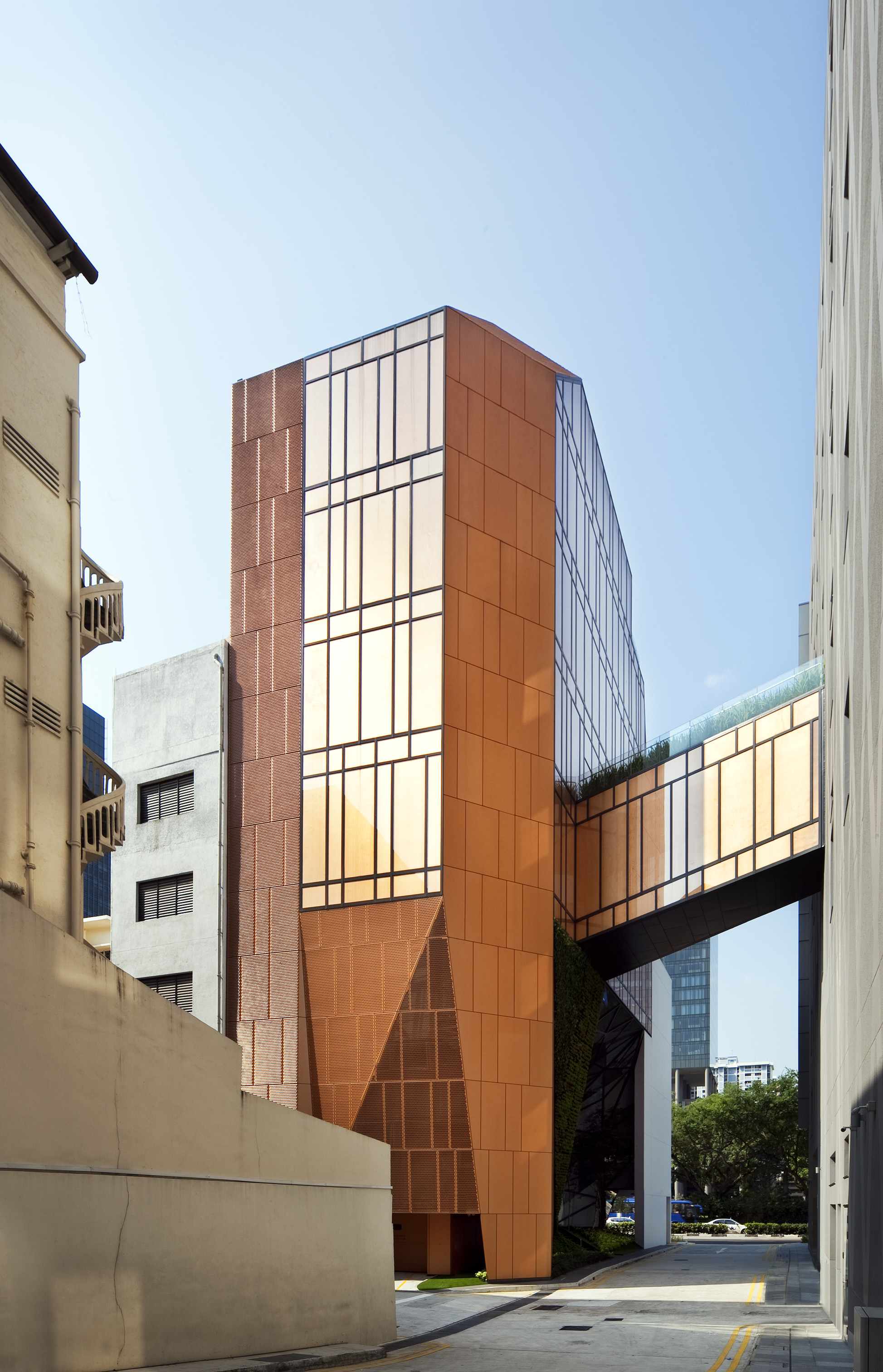 Theaters and art halls on street level encourage community involvement [2], Theaters created with box-in-box design to eliminate noise [3], separated tower design allows breezeway between towers [2], Naturally ventilated classrooms are kept cool with layered meshes and screens [3].