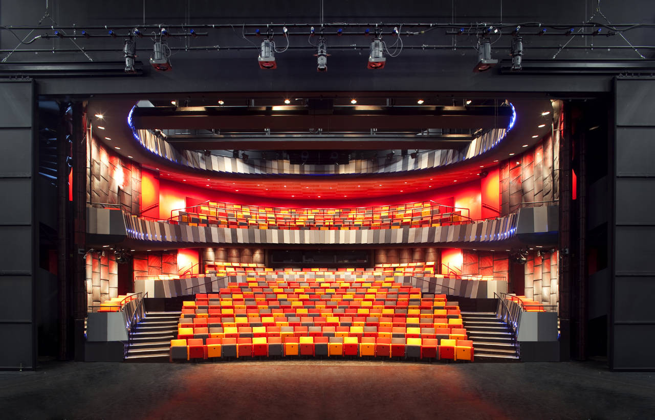 AE Interests: Housed inside a sphere like shape [5], 400,000 timber beads used to reduce echo on backstage [a], 560 adjustable seats can be removed to create thrust stage [d], lobby constructed of untreated wood, steel and timber [d], winner of president’s design award [d].