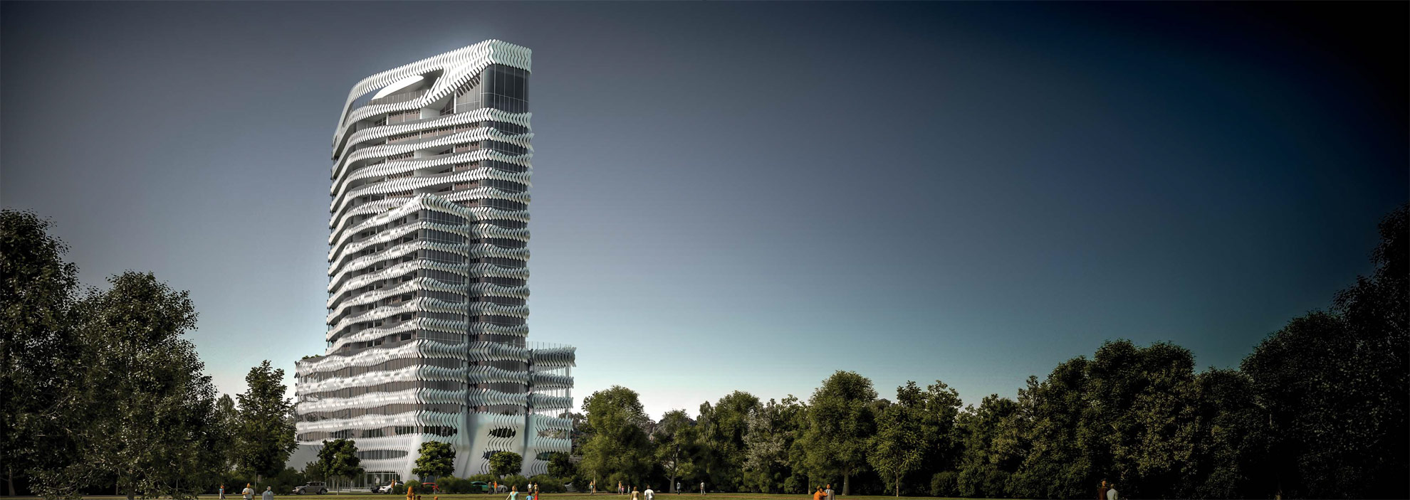 AE Interests: Curved aluminum sheets along the exterior wall create a cloud like appearance; panels provide both aesthetics and solar shading. Structural elements are cast concrete; mixed use complex; [a] no air conditioning required; all cooling is done by pumping cool water through the walls. Located adjacent to the Rhine River; micro climate terraces throughout the upper floors. [b]
