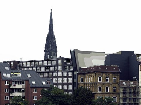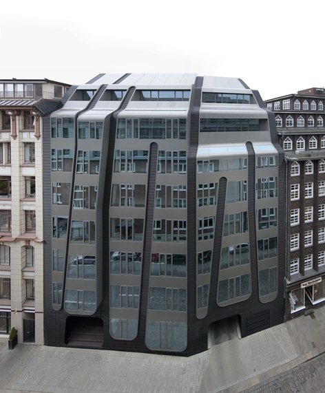 AE Interest: Triangular footprint, 26.4m front, 1.3m rear; placed directly between two buildings. Facade is built from sheet and corrugated metal. Texture and color of the metals allow for the building to fit in with its more classical neighbors; cantilevered elements on the facade match the massing in adjacent building. Part of larger “Hafen City” development. [a]