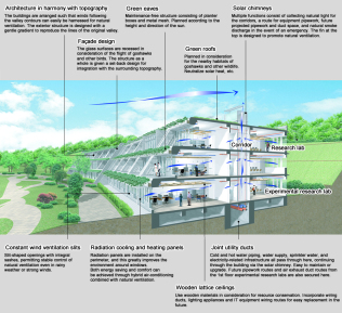 AE Interest: university, net-zero energy, photovoltaic panels, natural ventilation, thermal buffer spaces, biophilic design, hybrid cooling system, facade that can be dismantled and recreated, cross ventilation, natural water purification landscape, WELL Gold Certified