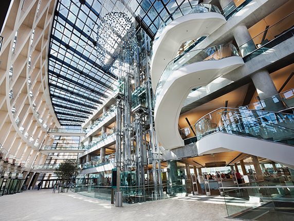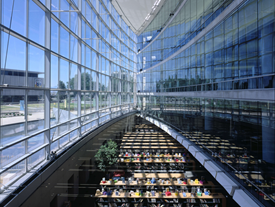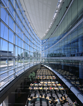 AE Interest: Glass curtain walls were designed to be flexible and move when stressed. All the glass in the building is a hybrid tempered laminate that disintegrates into pebbles if broken. The skylights are designed to pull apart into sections rather than break and fall. The Crescent Wall tilts inward 21 feet at its center to keep it from moving back and forth.
