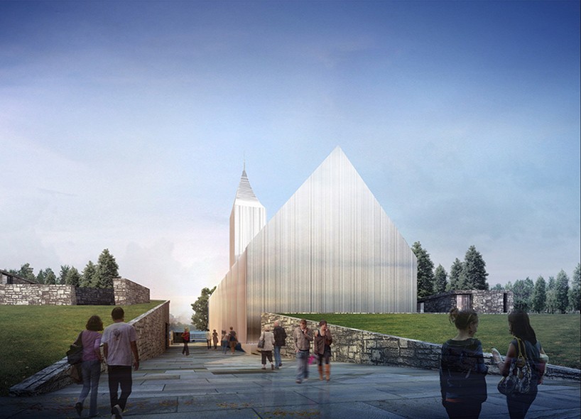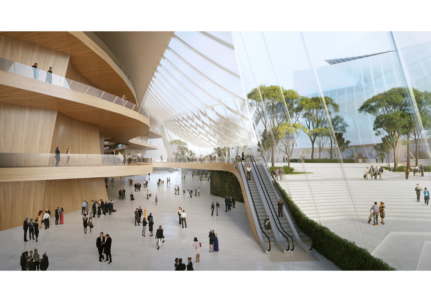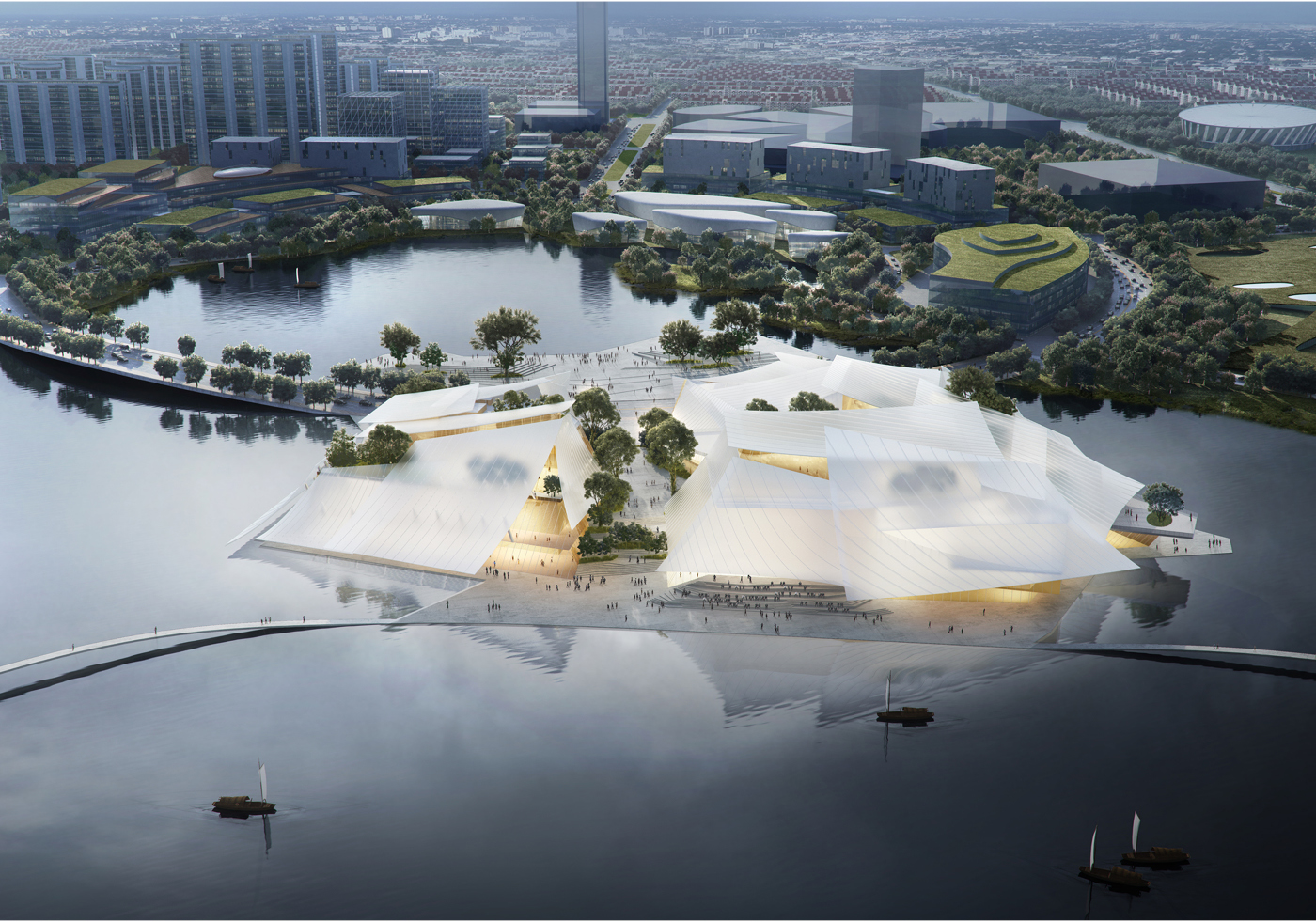 “Floats” on Dongyang River as a Chinese junk. Envisioned as a community space with many entrances and incorporated green space. Passive solar design uses translucent glass facade as warming “greenhouse” in the winter, allows airflow and ventilation in the summer. Includes two theaters that seat 1600 and 1200 respectively, and a conference center that seats 2000. Seats Construction will begin in 2020.