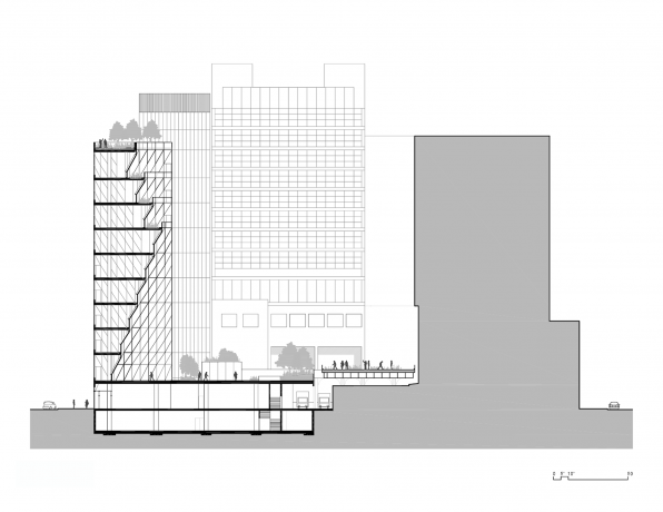 145,500 sqf mixed-use building targeting LEED Gold. The geometric facade allows for light to reach public green space of the High Line. The facade is achieved with one tilted diamond panel surrounded by four triangular panels that allow for standard stack joints.