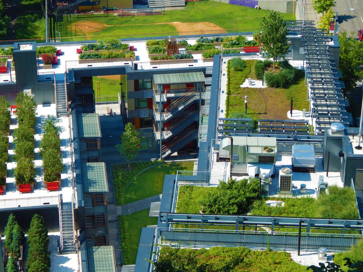 222 affordable housing units, retail, community health center, and live work units in one complex composed of three buildings. The complex is highly sustainable, featuring a green roof, community vegetable gardens, a 66kW solar panel system, onsite cogeneration, rainwater harvesting and hardy landscaping. LEED Gold.