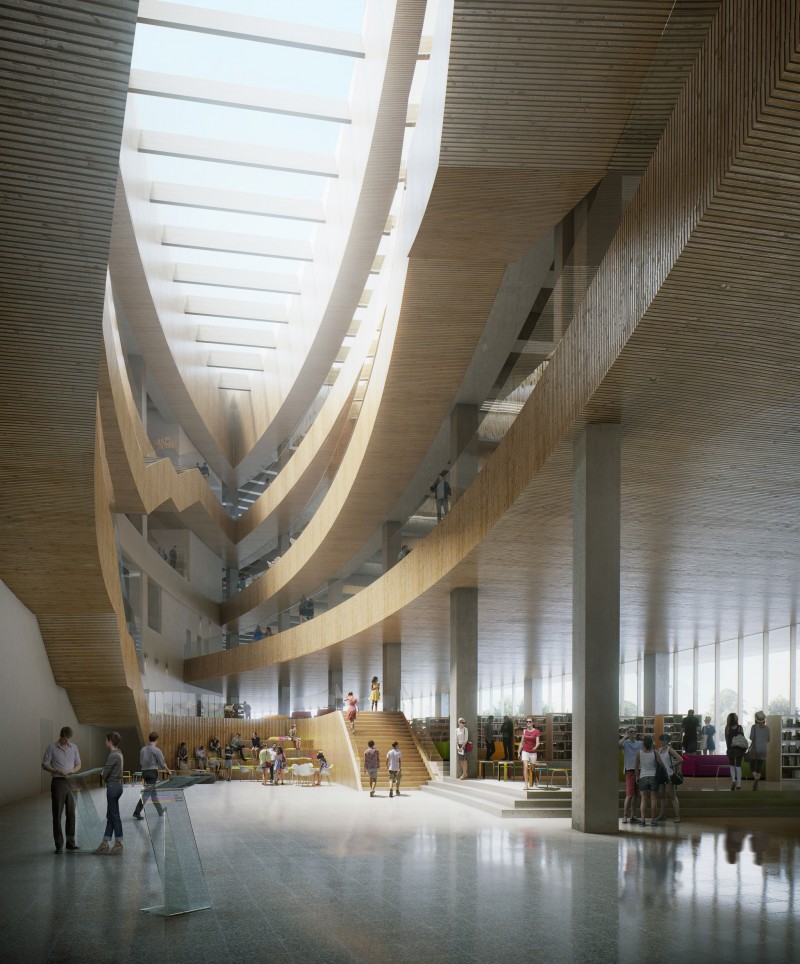 Oval-shaped, multi-faceted public library. Exterior is wrapped in a textured facade with translucent fritted glass panels used to screen private study areas and clear glass used for public areas. Interior centers around a four-story atrium topped with a skylight. Multi-functional building with meeting space, activity centers, cafe, theater, reading rooms, and conference rooms. [a]