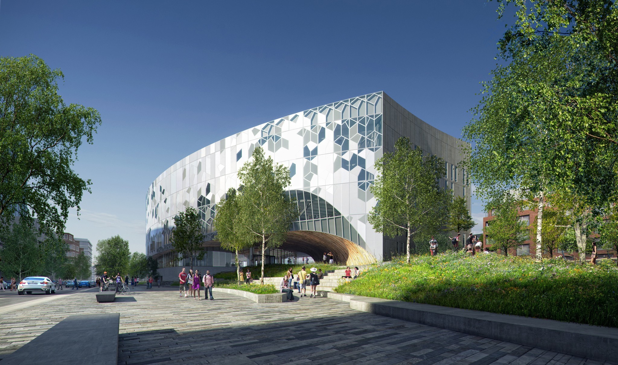 Cultural Center. Guided by LEED international standards, energy-efficient. Facade is made from CNC bent stainless steel tubes that are individually formed and wrapped around the building. [a]