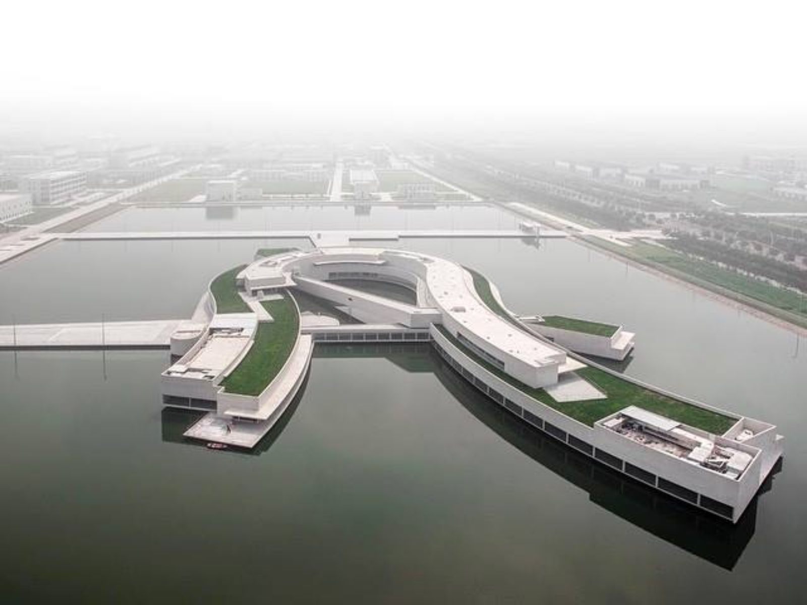 -Employs the most advanced manufacturing processes and technologies; designed in a non-linear fashion; built over an artificial lake; aimed at blending the manufacturing process of glass with water (harmony between man and environment); first structure by Siza built over water; built of white exposed concrete; designed to deeply contrast against the orthogonal orderliness of the surrounding factory complex. [1]