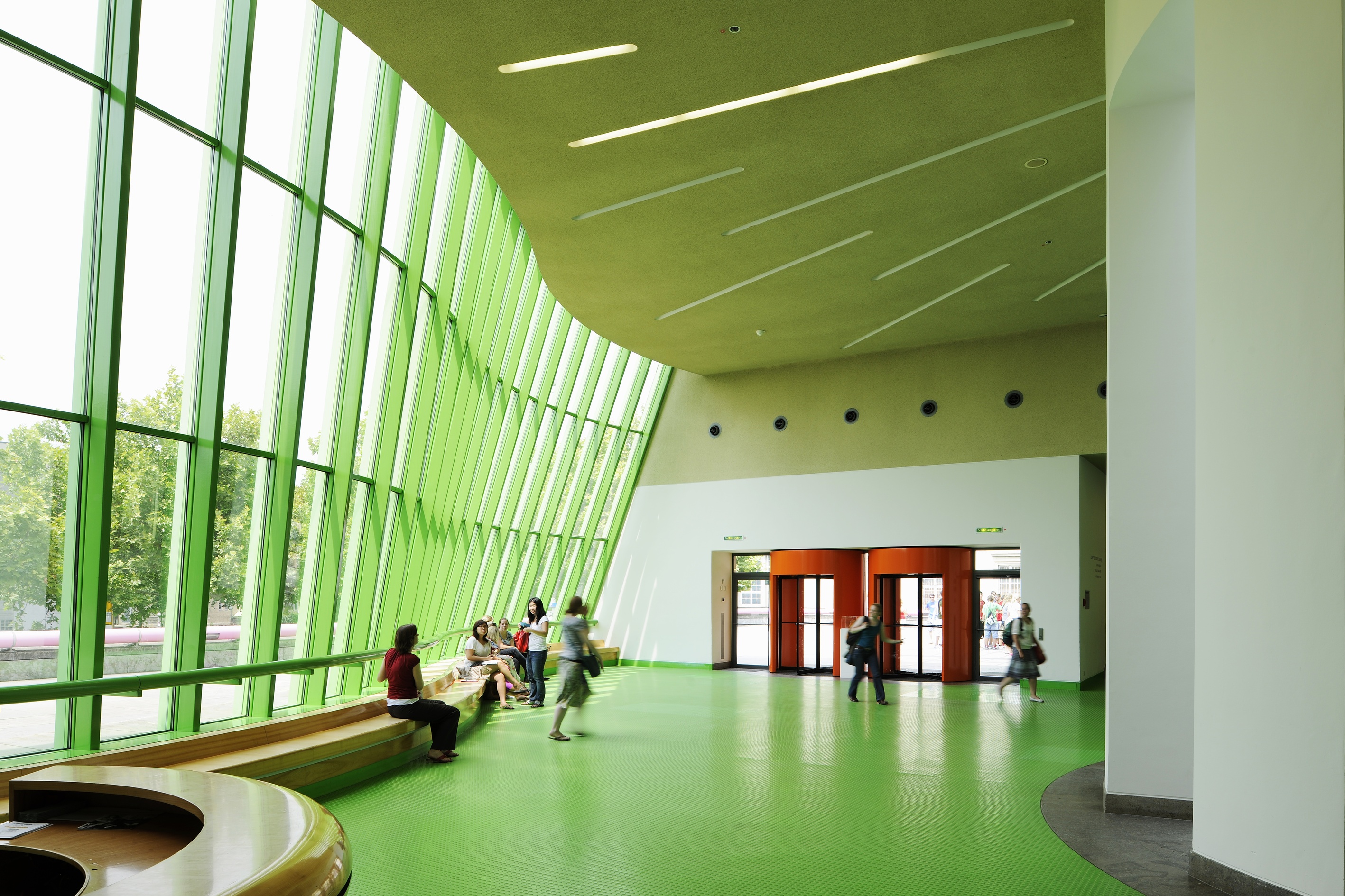 AE Interests: Epitomizes the first stage of Post-Modernism by combining classical museum elements (sandstone) with industrial materials (vibrantly colored steel) to unite the monumental and informal, incorporates the slope of the landscape into the design, prominent open top rotunda