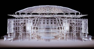 AE Interest: copper clad and stucco, acoustically shaped wall surfaces, large volume, edge lighting of translucent ceiling glass, public theater venue, 250-seat outdoor amphitheater.
