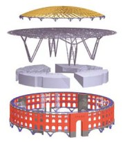 AE Interest: structurally independent internal “segment”, transformation of redundant bullring, old base excavation and new base insertion for existing walls with composite arches, giant roof terrace with domed roof, and natural energy sources used.