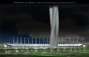 AE interests: The rotating plan consists of three cylinders offset two degrees per floor; Interwoven concrete slant columns; Bracing visible at night through the pale green glass skin; Interlayer screens will shade the glass according to solar orientation.