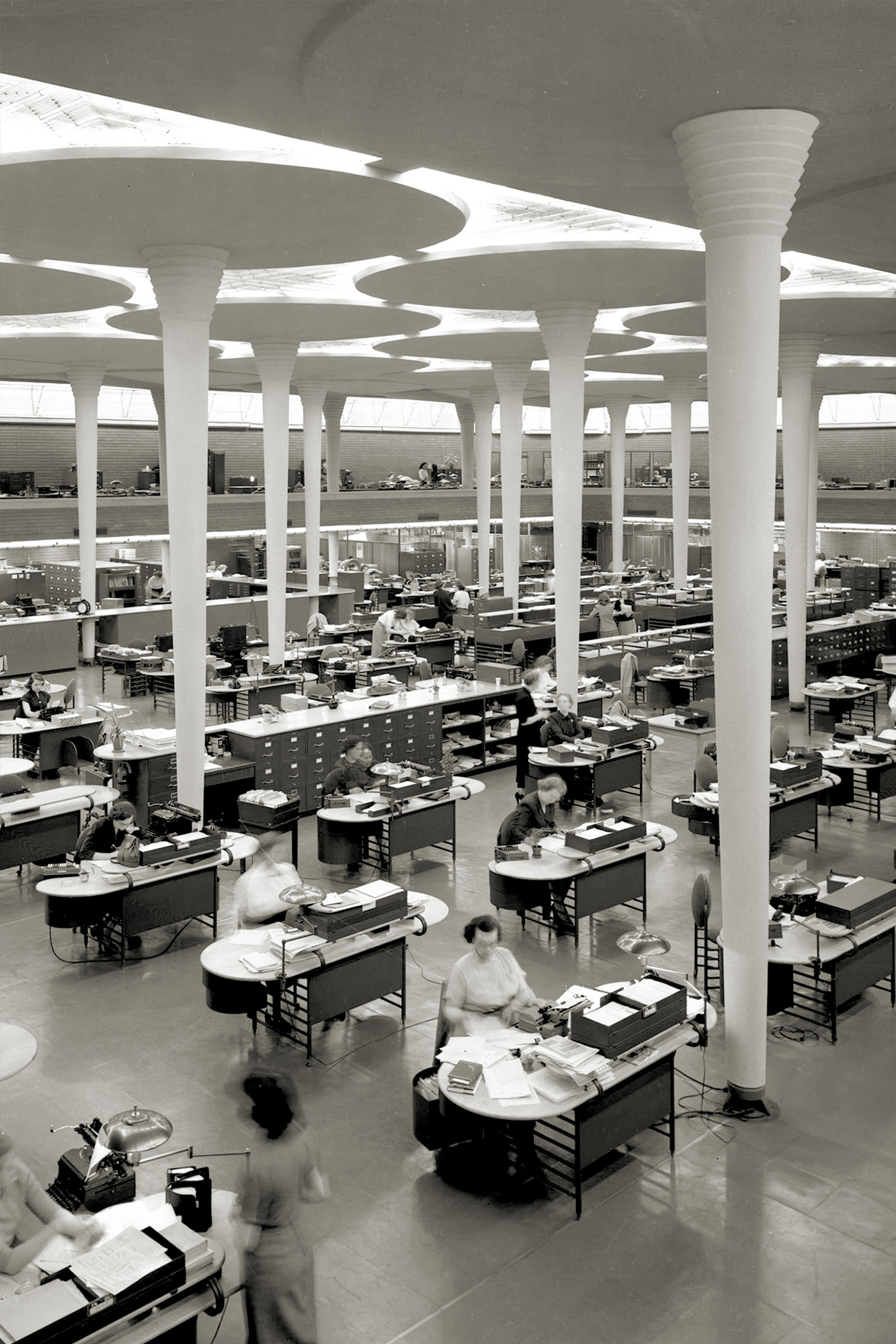 AE Interests: 43 miles of glass Pyrex tubing forms windows; 200 special shapes of Cherokee Red brick used for interior/exterior walls; the columns in the Great Workroom, referred to as “lily pads;” columns are 9 inches in diameter at the base, 18.5 ft in diameter at the top; the research tower is supported by a central core that extends 54 feet into the ground.