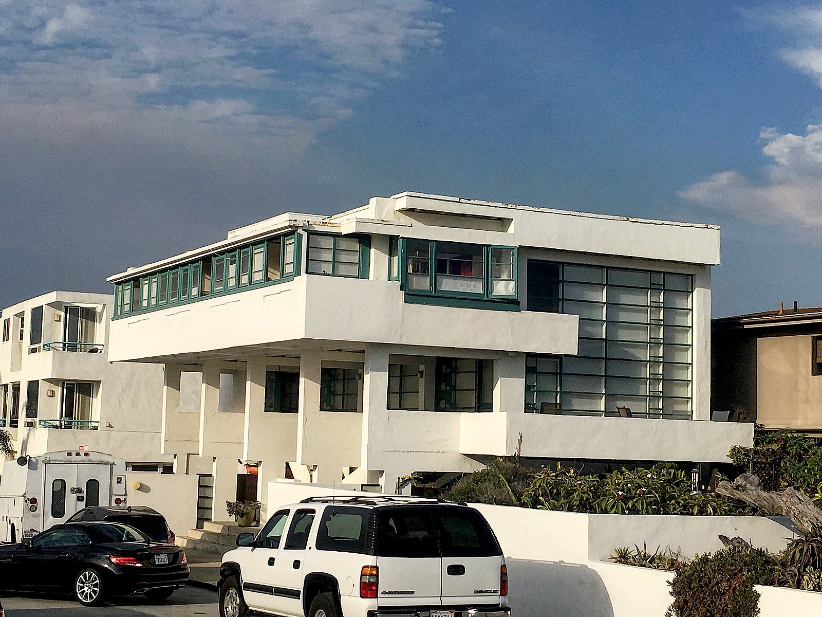 AE Interests: house is lifted and cradled in 5 parallel poured-in-place concrete frames in the shape of figure 8’s; protected from earthquakes – lightweight walls suspended from the structure to move independently during tremors; curtain wall windows on the east/south sides facing the ocean; healthy lifestyle arrangement – living quarters are on the north side to maximize fresh air circulation; bedrooms have windows for cross ventilation, so no A/C needed.