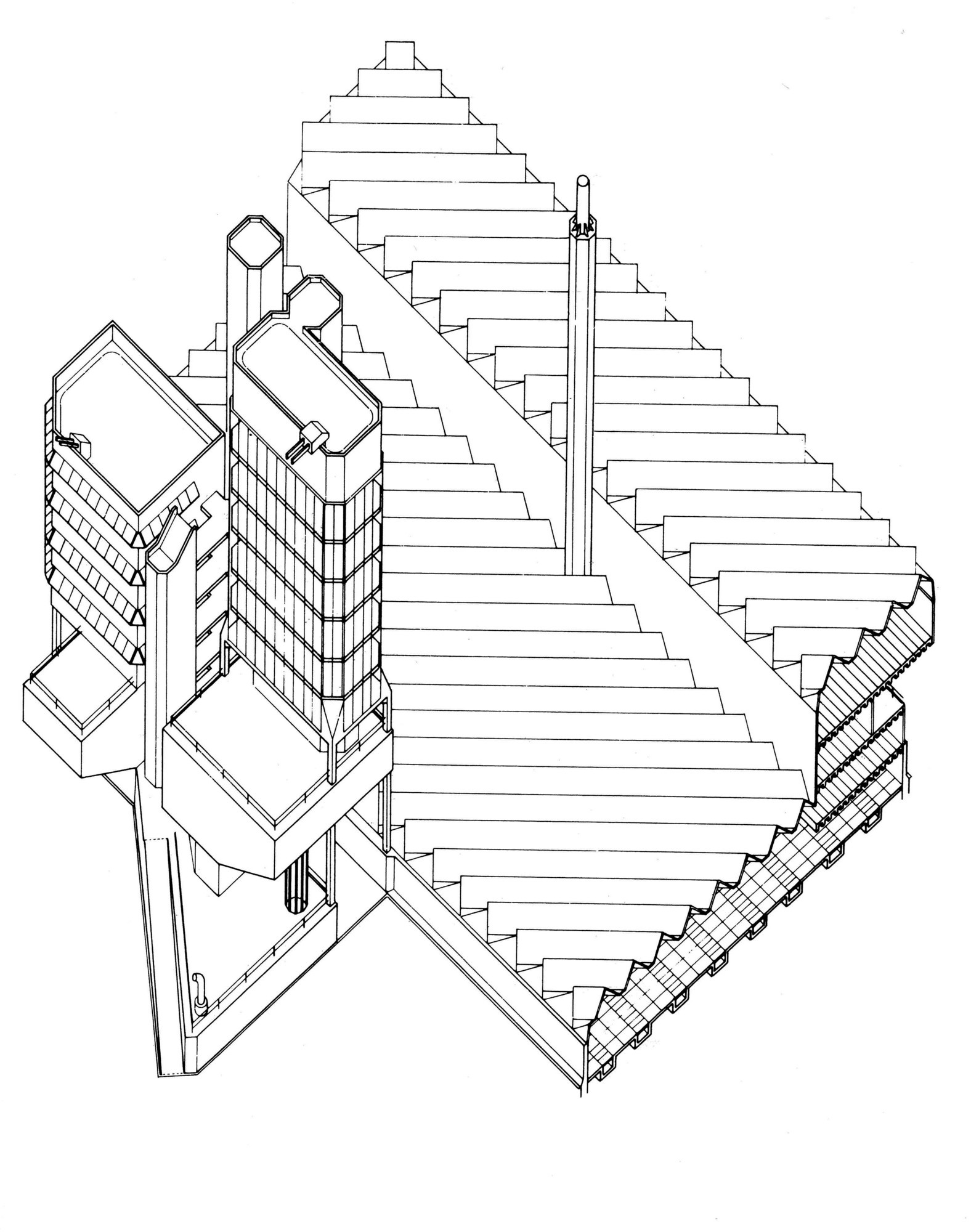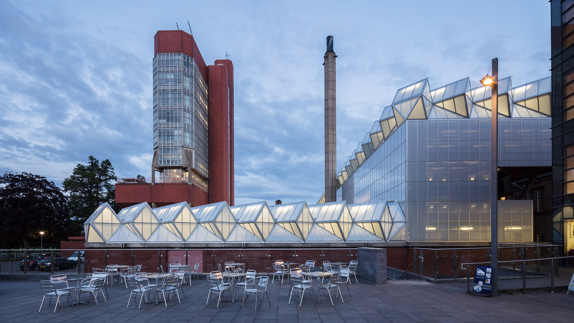 AE Interests: First post-modernist building in the UK, Two joined towers sitting on cantilevered lecture halls, 11th floor serves as a water tank that supplies a pressure head to the hydraulics laboratory on the ground floor via enormous pipes that run down the side of the main staircase, Two large glass roofs angled at 45 degrees to the towers face north to provide illumination without direct sunlight, all about function.