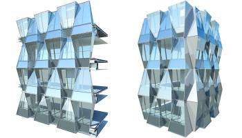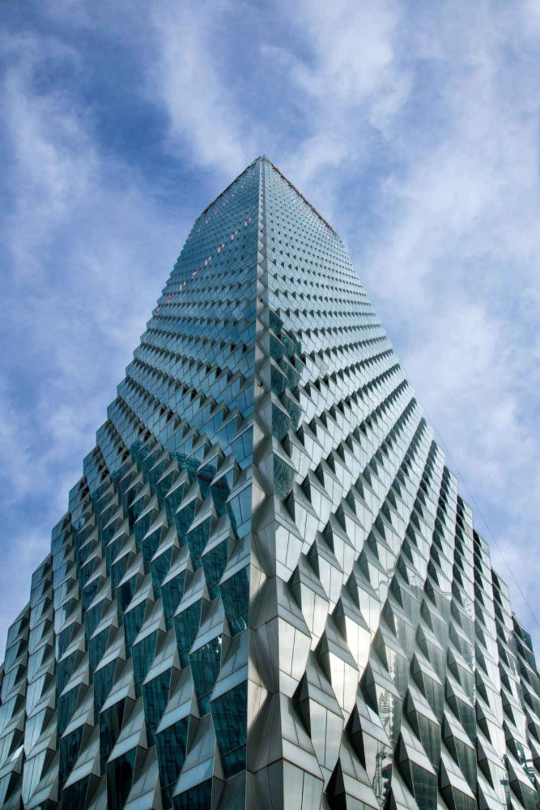 trapezoidal glass curtain that capture and reflect light, 55 stories, 260 meters tall, rectangular design around central atrium, windows provide self shading that is sustainable & efficient, mixed use with commercial & residential.
